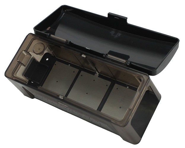 - Отсек для приманки расположен с наружной стороны корпуса. Это очень удобно, т.к. для размещения приманки не нужно выключать ловушку и открывать крышку. Приманку необходимо довольно часто обновлять, поэтому отдельный отсек для неё — очень удачное конструкторское решение.