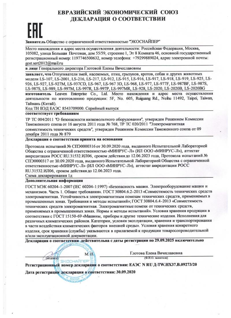 Стационарный отпугиватель животных «Экоснайпер LS-987S»